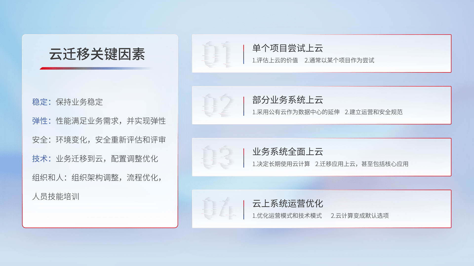 结合实际业务,,,,从规划设计、、云平台选型、、、、云原生改造、、、数据迁移、、、、集成交付,,,,迁移全过程为客户识别最佳上云路径,,,做好风险识别管理,,设计网络架构、、、身份权限、、、、安全审计合规、、操作审计、、日志审计、、、、监控告警策略、、、、多站点容灾设计等,,,对云上基础设施进行整体规划,,,提升IT治理水平,,,,以满足弹性、、、、高可用、、高性能的需求。。。。