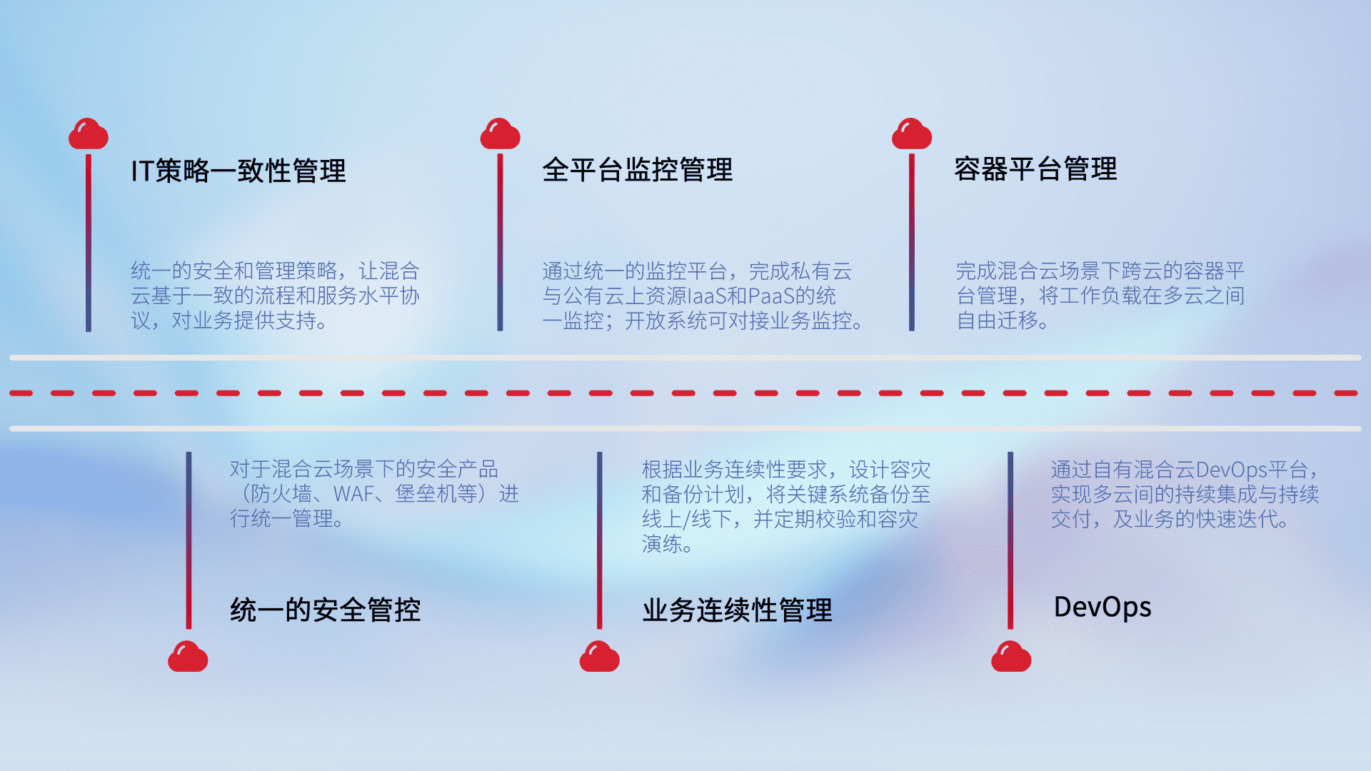 通过多云纳管,,,,以统一的资源数据模型把客户的云资源进行抽象和封装,,,进而实现对多云资源的统一操作,,保障云资源管理的可靠性、、、、稳定性与可用性。。。量身定制化运维内容,,,配置、、、、开发运维、、、、补丁管理、、、、备份、、监控、、、认证和访问管理、、、审计和日常巡检等,,保障在用云过程中的可靠度,,,稳定度以及高可用率。。。。