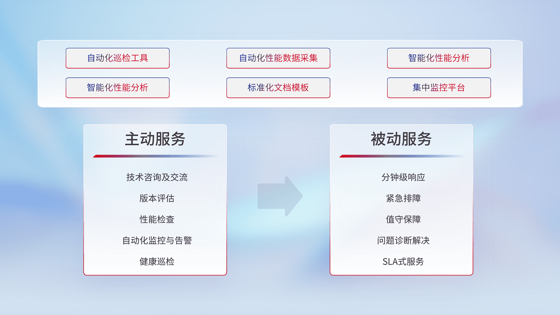 智能化工具和标准化文档,,,,保障服务质量,,提供主动服务(包含技术咨询、、、版本评估、、、性能检查、、、自动化监控与告警、、、健康巡检)和被动服务包含(分钟级响应、、、紧急排障、、、、值守保障、、、、问题诊断解决、、SLA服务)。。。。